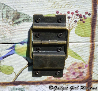 The lid is held up with one strong brass coloured hinge and its strong too. The lid itself is a really substantial weight which makes you feel like you have an old antique trunk.